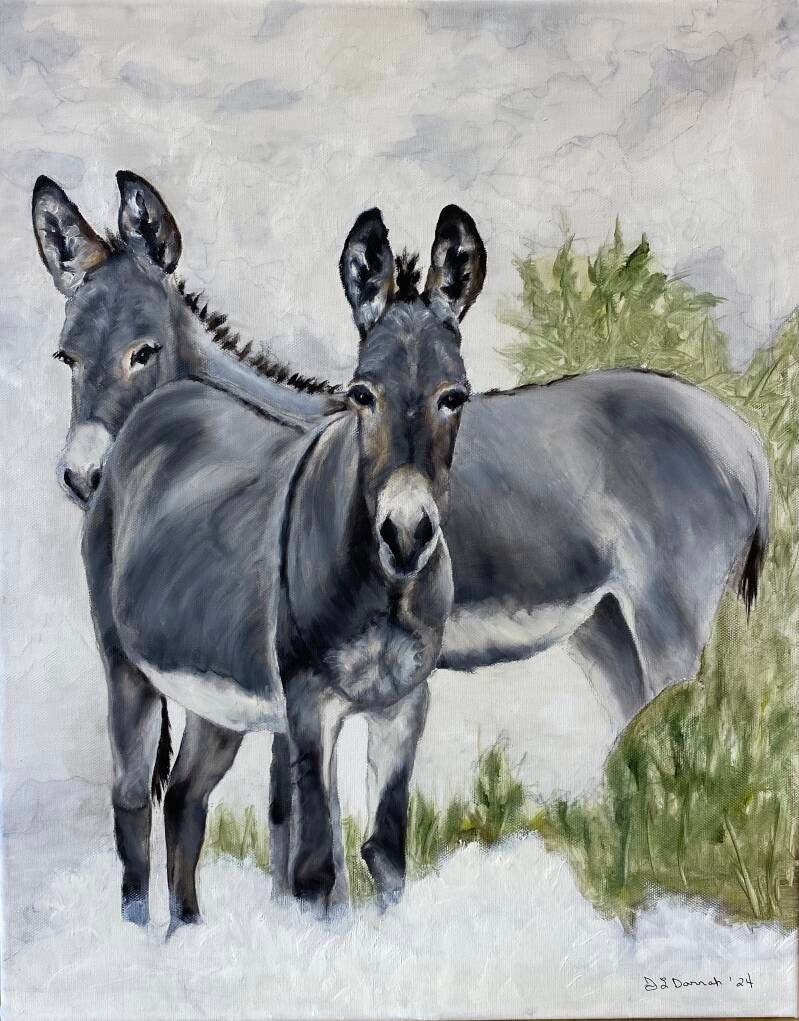 Burros came to the Americas with the Spanish. Sometimes abandoned, they thrived in the desert southwest. Extremely hardy but adverse to cold and rain, their ancestors have been here....longer than most of our ancestors. The proceeds of the sale of this painting will be directed in whole to the non-profit organization "Wild Horse Education" promoting the cause of wild horses and burros.